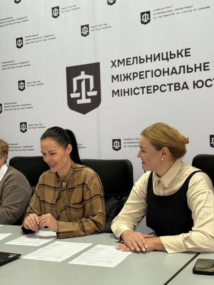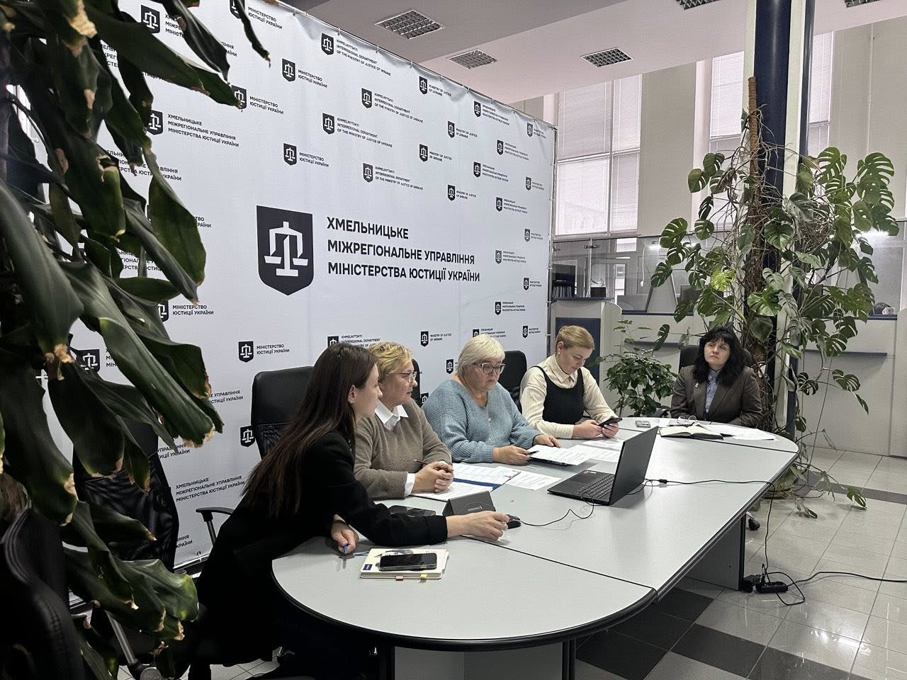 У Хмельницькому відбулося засідання «Нотаріальної школи» у форматі відеоконференції за участю нотаріальної спільноти Хмельниччини. Захід відкрили начальник Хмельницького міжрегіонального управління Міністерства юстиції України Олена Токарчук та начальник Управління нотаріату Наталія Муляр, наголосивши на важливості дотримання стандартів нотаріальної діяльності та якісної організації документування.