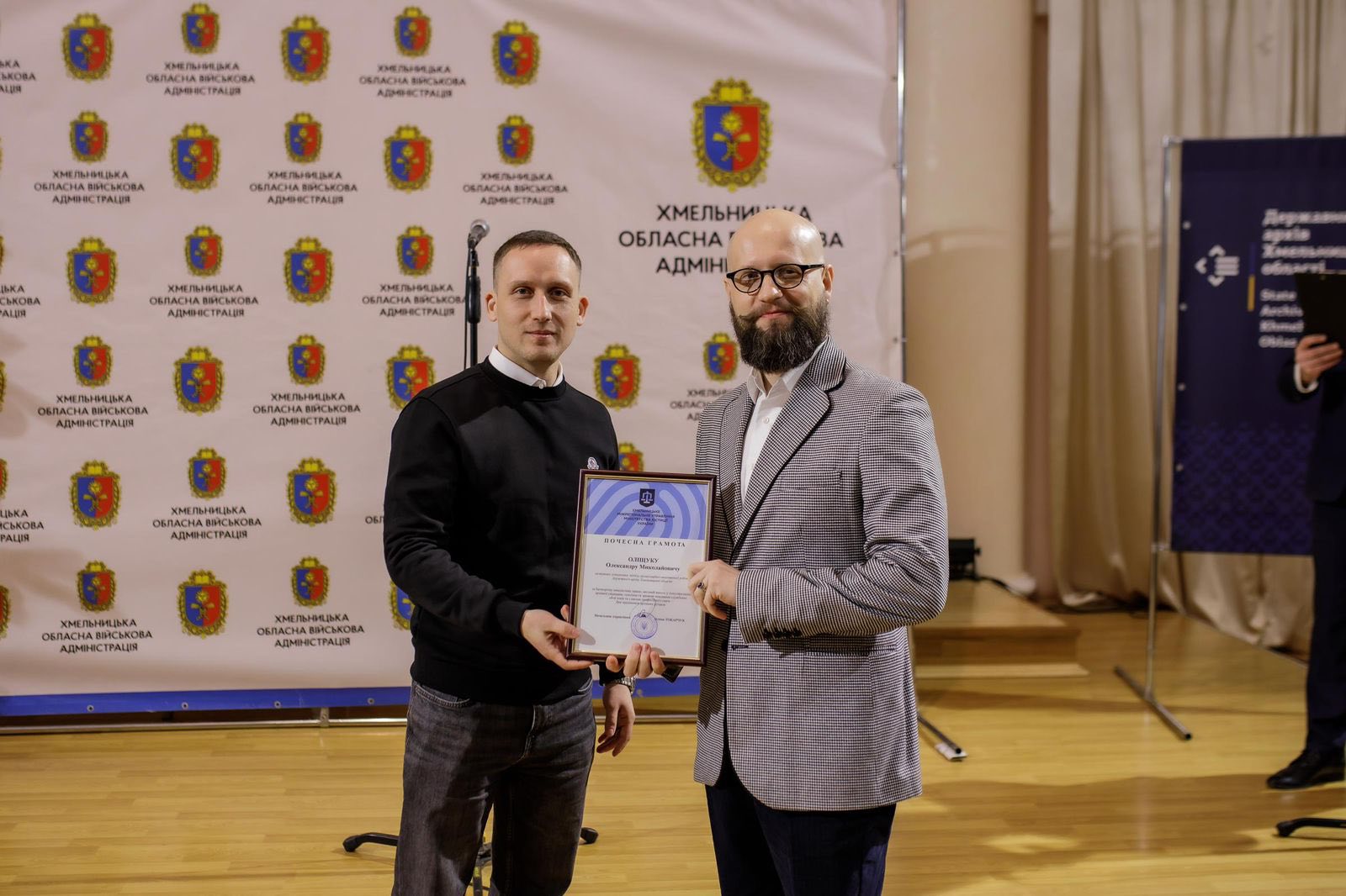 Відзнаки вручили в.о. першого заступника начальника Хмельницького міжрегіонального управління Міністерства юстиції України Олександр Гутник спільно з керівництвом області та Головою Державної архівної служби України Анатолієм Хромовим. У вітальному слові Олександр Гутник наголосив на ролі архівних установ як основи історичної пам’яті держави та важливого елементу інформаційної безпеки.